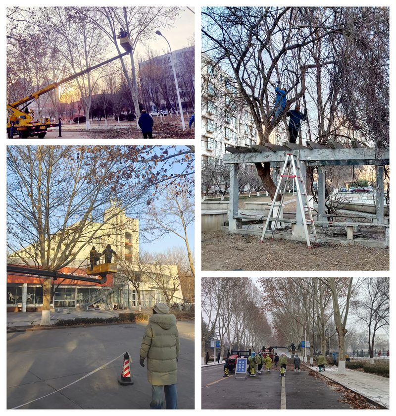 中心工作人员利用冬季植物休眠黄金期,对学校青年路、鸿图路、弘毅路、博雅路、湖滨路、广场东西路、文化路、二体西侧、梅园南侧、三四食堂周围的法桐、国槐等1000余株进行修剪,不仅消除了枯枝、病虫枝及过低枝条带来的安全隐患,也优化了树木冠形,促进其春季健康萌发。