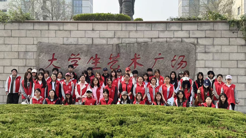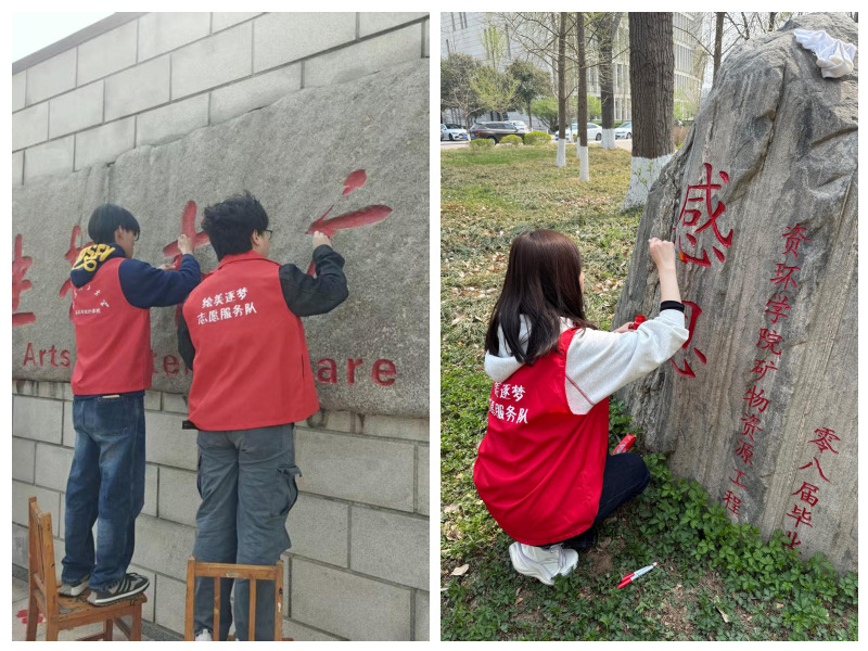 活动现场,身着“绘美逐梦志愿服务队”红马甲的志愿者们分工协作、有序作业,先对石面进行清洁,再反复描摹、逐层上色,让模糊的文字重新变得清晰醒目。春日暖阳下,志愿者们俯身专注描摹的身影,成为校园里一道充满活力的风景线。